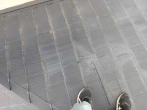 ドローンで大屋根をまんべんなく撮影しました。下屋根と同様、割れが多少ありましたが、現時点ですぐに対応が必要な深刻な状況ではありませんでした。一方で、気がついた点としては雨樋の勾配が悪く、雨水が流れずに溜まっている箇所があることです。また、これは下屋根にも言えることなのですが、塗装した時に縁切り部材(タスペーサー)が挿入されていません。ただ、塗装の劣化具合からすると屋根塗装から10年程度は経っていると思われるので、その間、雨漏りがないのであれば縁切り不良による野地板の不具合は無いともいます。(屋根塗装の時にタスペーサー挿入での縁切りではなく、カッターなどで行う縁切りを実施した可能性があります)