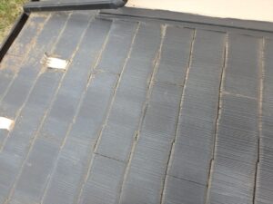 コロニアルの割れがありますね。『コロニアルが割れているから即雨漏りします』というわけではありません。割れているのはコロニアルであってその下にあるアスファルトルーフィングが破断していなければ雨漏りは起こりません。また、コロニアルは重ねて葺かれているため、見えている部分は全体の半分ほどです。割れていてもその下に別のコロニアルが存在します。したがって『コロニアルが割れているから大変だ、すぐに工事が必要だ』といった言葉に惑わされないようにしてください。