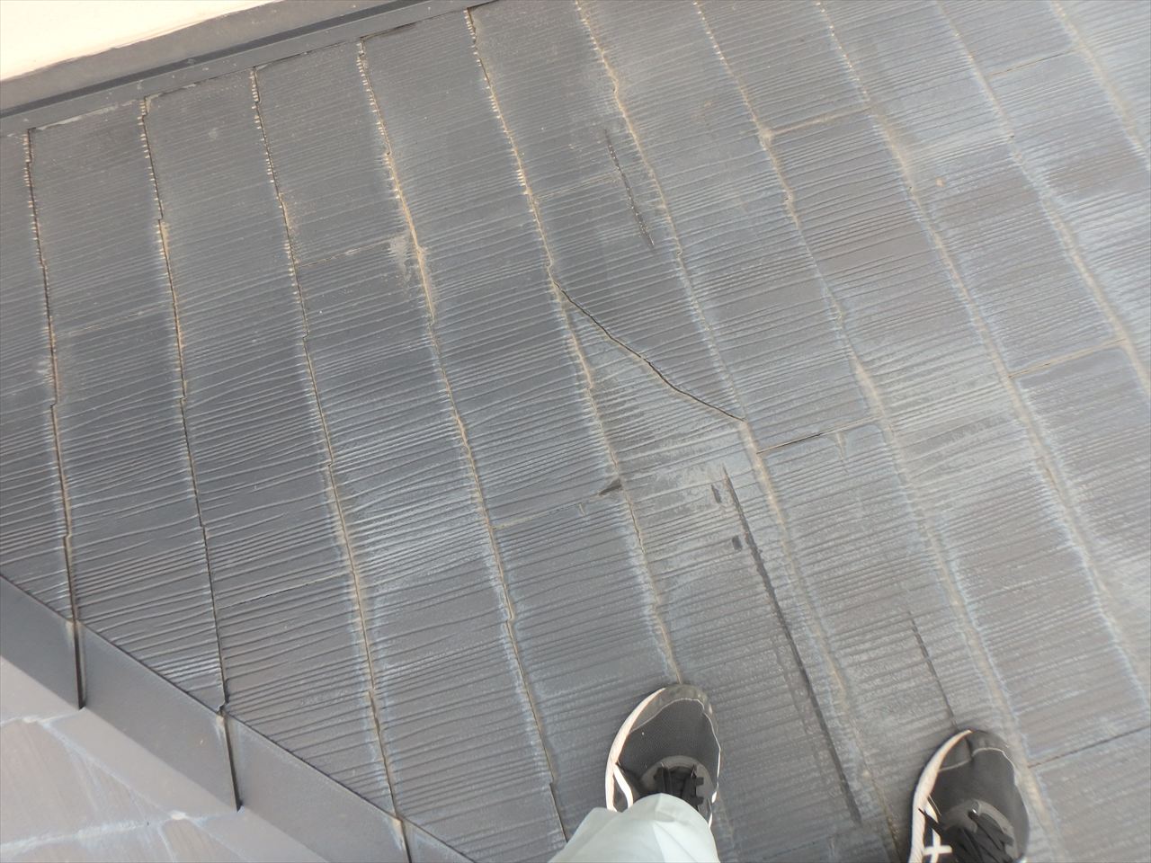 ドローンで大屋根をまんべんなく撮影しました。下屋根と同様、割れが多少ありましたが、現時点ですぐに対応が必要な深刻な状況ではありませんでした。一方で、気がついた点としては雨樋の勾配が悪く、雨水が流れずに溜まっている箇所があることです。また、これは下屋根にも言えることなのですが、塗装した時に縁切り部材(タスペーサー)が挿入されていません。ただ、塗装の劣化具合からすると屋根塗装から10年程度は経っていると思われるので、その間、雨漏りがないのであれば縁切り不良による野地板の不具合は無いともいます。(屋根塗装の時にタスペーサー挿入での縁切りではなく、カッターなどで行う縁切りを実施した可能性があります)