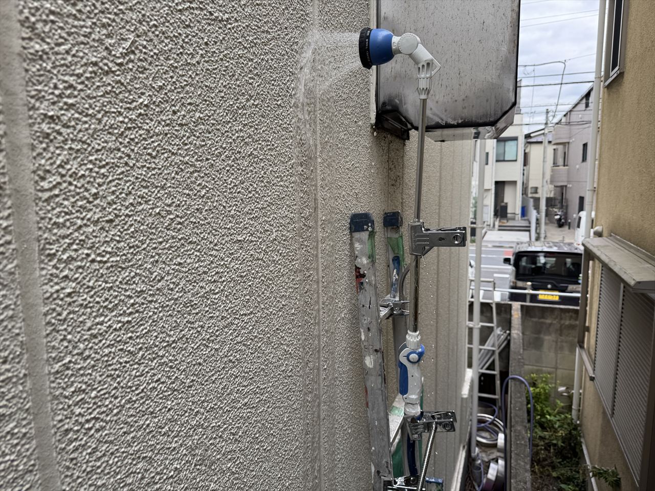 そして次はALC板のひび割れをシーリングで補修した跡に散水しました。