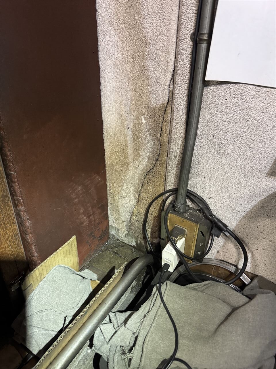 まずは床と基礎立ち上がりからの漏水を疑い、基礎と土間(不整地)に散水しました。鉄骨造の基本散水時間90分散水しましたが、雨漏りは再現されませんでした。