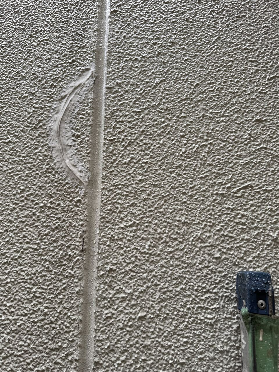 補修した跡の少し下、縦の取り合いシーリング左脇に小さなひび割れがあります。