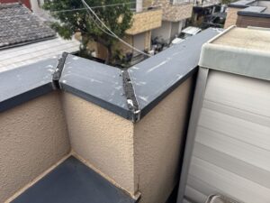 こちらは現地調査の時の写真です。笠木板金を固定するため真上から釘を打っています。通称『脳天釘打ち』といって水平面に穴を開けるという暴挙とも言える方法です。もちろん、この下にアスファルトフェルトを施工していれば、まだ雨水浸入の頻度は少ないかもしれませんが、それでもこの状態で20年以上の年月は建物にとって辛い状況だったと言えます。