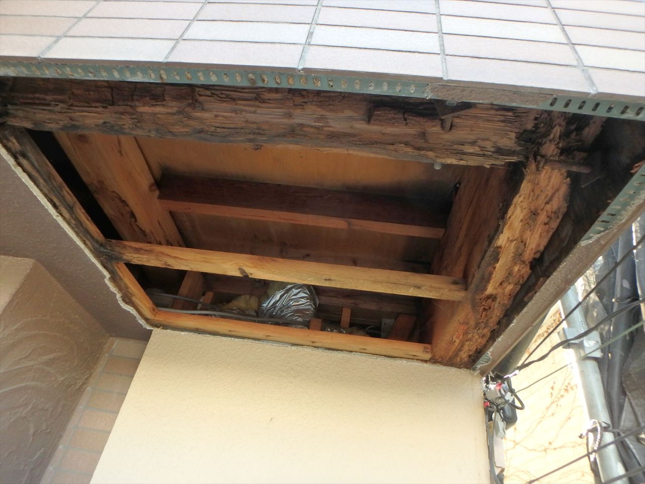 軒天井を解体してもっと寒くなりました…構造体が相当傷んでしまっています。構造体を緊結する金物があらわになってしまっています。