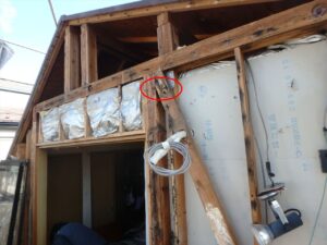 そして建物の外壁も解体します。こちらの建物は合板に『ラスカット』を使用していました。このラスカット、合板と2次防水が一体となっていまして、合板のつなぎ目には専用の『ラスカットシール』という止水材を充填して2次防水を担保するというものです。しかし建物の動きなどにこのラスカットシールが追随できず、表面のモルタルまでヒビが入るとそこから簡単に雨水が浸入してしまうという弱点があります。今回の工事でもこのラスカットのつなぎ目から入った雨水が間柱を痛めているのが確認されました。