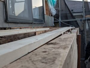 こちらの現場、最初は軒天井が割れているという事から始まりましたが、当初予想されていた雨水の被害より重症でした。結局、構造体である桁や梁、柱などにも被害が及んでおりまして、バルコニーの作り変えのようになっています。